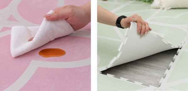 撥水性があるので汚れてしまってもサッと拭くことができます。また、ジョイント式なので汚れた箇所だけ取り外して水での丸洗いや、ダメージがひどい箇所だけ取り換えることも簡単にできます。お掃除ロボにも対応しています。