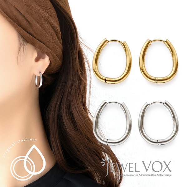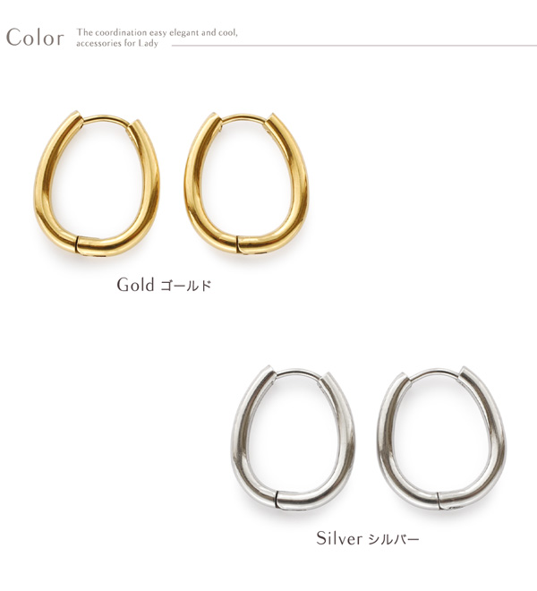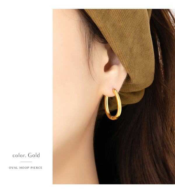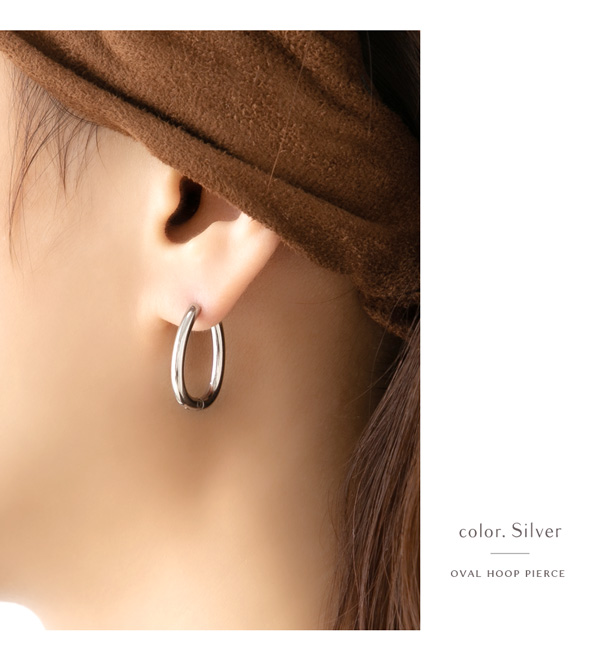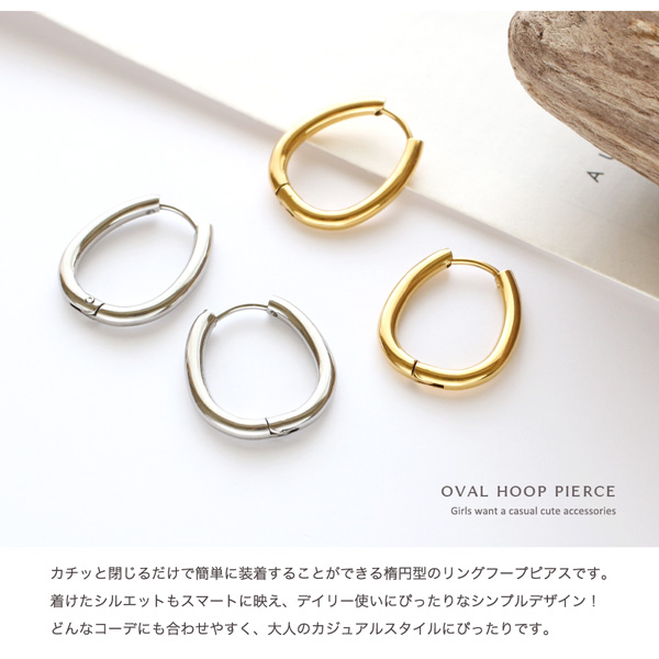 カチッと閉じるだけで簡単に装着することができる楕円型のリングフープピアスです。