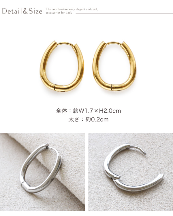 | カチッと閉じるだけで簡単に装着することができる楕円型のリングフープピアスです。 着けたシルエットもスマートに映え、デイリー使いにぴったりなシンプルデザイン! どんなコーデにも合わせやすく、大人のカジュアルスタイルにぴったりです。 | |