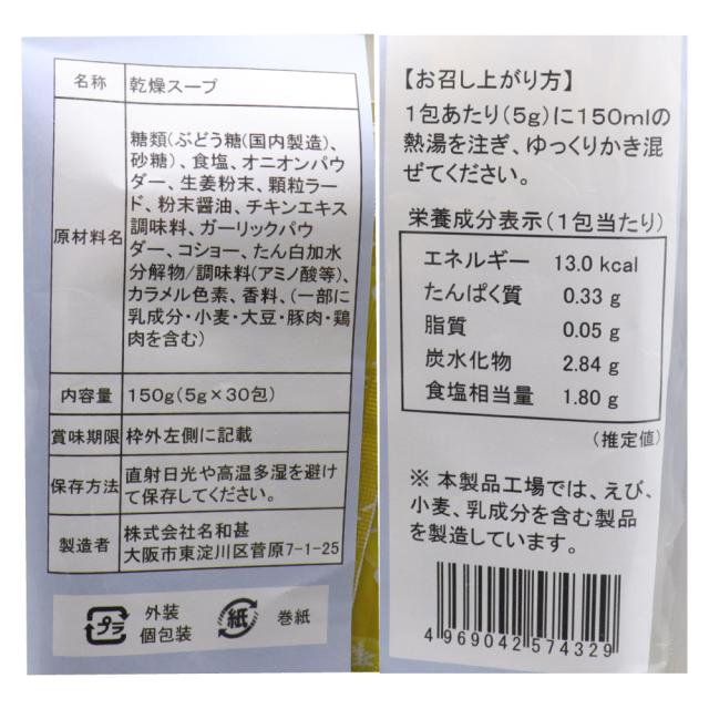 糖類(ぶどう糖(国内製造)、砂糖)、食塩、オニオンパウダー、生姜粉末、顆粒ラード、粉末醤油、チキンエキス調味料、ガーリックパウダー、コショー、たん白加水分解物/調味料(アミノ酸等)、カラメル色素、香料、(一部に乳成分・小麦・大豆・豚肉・鶏肉を含む)