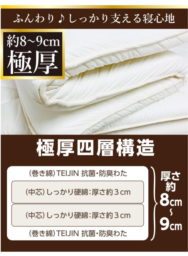 マンションにお住まいの方に【品名:レンゲ】湿気対策 4層 敷き布団 極厚 四層 軽量 敷き布団 シングル 100×210cm 日本製 帝人 テイジン TEIJIN フィルケア(R) 固綿 硬綿2枚使用 敷きふとん 敷ふとん ボリュームタイプ 抗菌 防臭 【圧縮梱包】