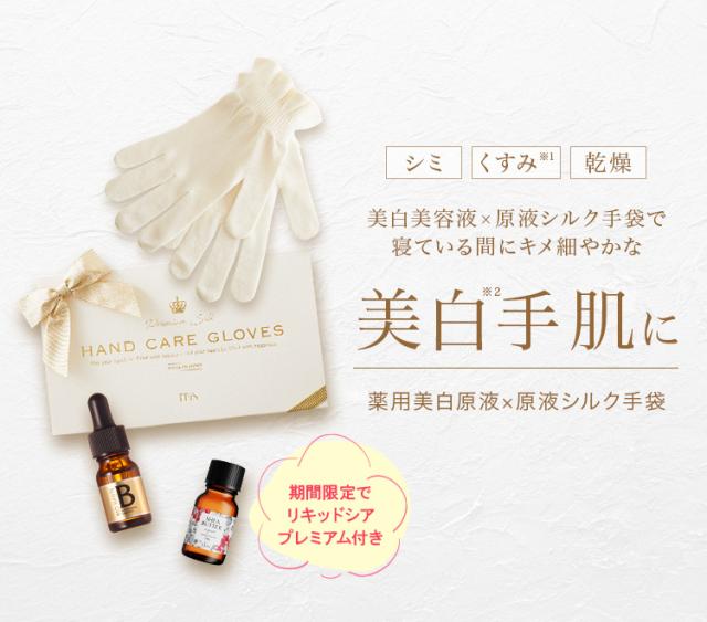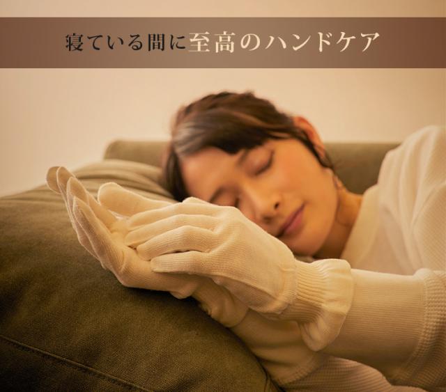 おやすみ時美白原液を塗って、シルク手袋をつけることで浸透力をサポート手のシミを予防し、透明感のある手肌へ導きます。