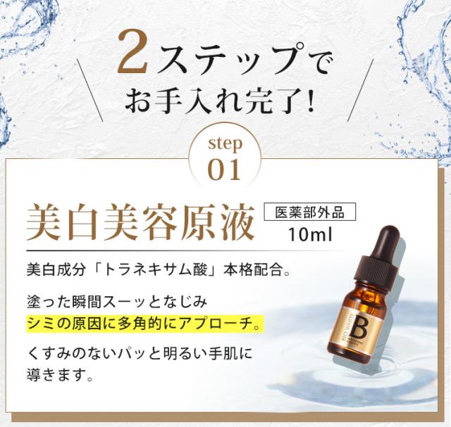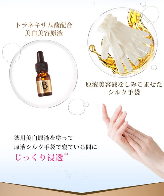 薬用美白原液「エビスビーホワイト」と、「原液美容液をしみ込ませたシルク手袋」のハンドケアセット。