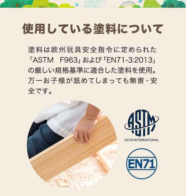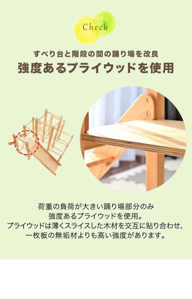 | 特記事項: ※絨毯の上など不安定な場所に置かないでください。転倒してケガや破損の原因になります。 ※本製品は室内専用です。屋外で使用しないでください。破損の原因になります。 ※火のそばに近づけて設置しないでください。火災の原因になります。 ※本体を水につけたり、水のかかる場所で使用しないでください。カビ・変色・変形の原因になります。 ※お手入れに塩素系・酸性タイプ等の洗剤は絶対に使用しないでください。カビ・変色したり、有毒ガスの発生により健康を害す事があります。 ※3人以上で同時に乗らないでください。 ※お子様がご使用の際は、けがをしたり、事故が起きないよう、必ず保護者の方が付き添い、目を離さないようご注意ください。 ※ご使用前、ご使用後は必ず点検を行ってください。万が一破損や異常があった場合は使用を控えてください。 ※荷重の負荷が大きい踊り場部分のみ、強度の有るプライウッドを使用しています。プライウッドは薄くスライスした木材を交互に貼り合わせているので、一枚板の無垢材よりも高い強度があります。 |