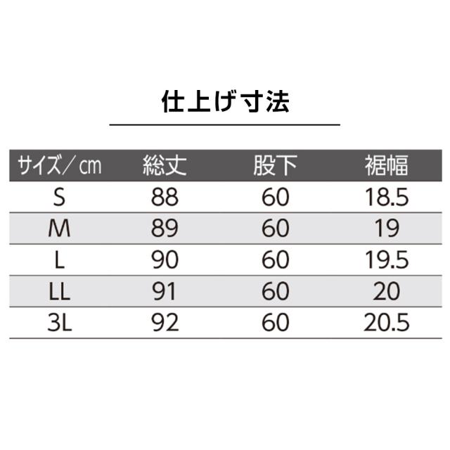 LLサイズ:ウエスト(77〜85)/ヒップ(97〜105)/総丈89/股下60/袖幅18