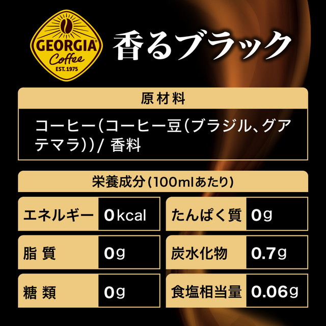 『ジョージア 香るブラック』は、淹れたてのような香りと深いコクが楽しめる、専門店仕立てのブラックコーヒーです。スペシャリティコーヒー専門店「猿田彦珈琲」監修のもと、深煎りの高級豆を使用し、挽きたて豆の香りと淹れたてのような香りの2大アロマを楽しめる「ダブルアロマ密封技術」で香り高い味わいを実現しています。