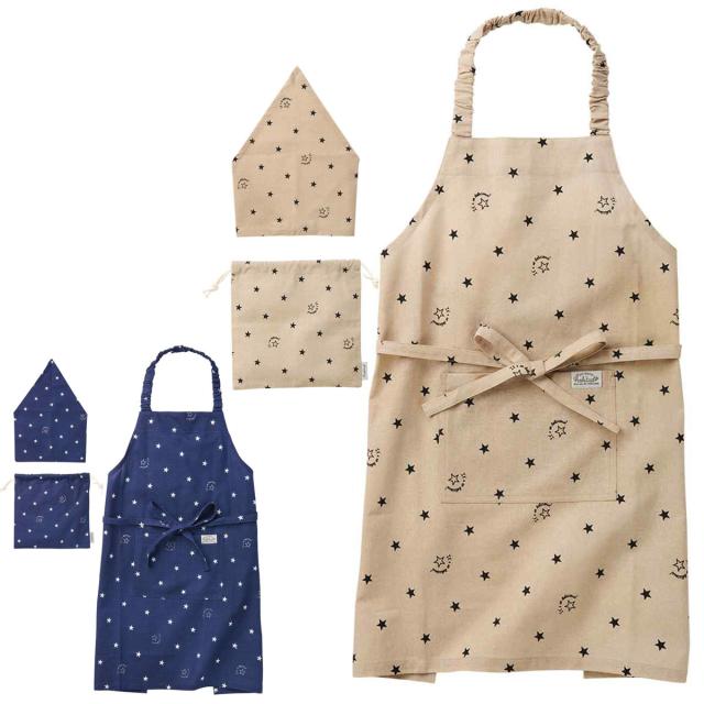 エプロン キッズ 3点セット 綿100% ポケット付き ケイト 星柄 ( 子供用エプロン キッズエプロン 子ども 三角巾 巾着袋 綿100 男の子 女の子 入園 入学 エプロンセット コットン 調理実習 クッキング 保育園 幼稚園 小学校 )