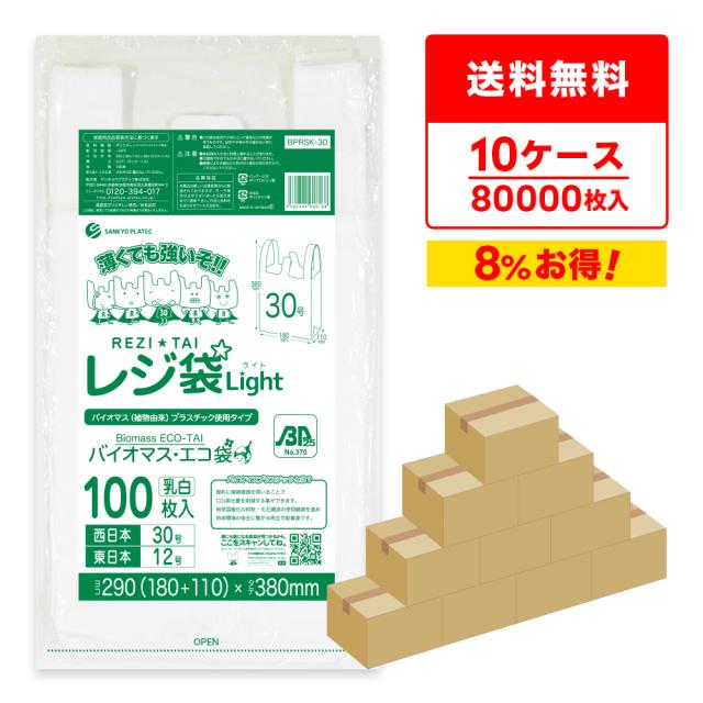 【まとめて10ケース】BPRSK-30-10 バイオマスプラスチック使用レジ袋 西日本30号(東日本12号) 0.011mm厚 乳白 100枚x80冊x10箱 薄手タイプ ブロック有 送料無料