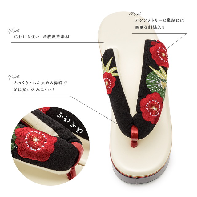 肌触りの良い天に、煌めく糸を使用した松竹梅の刺繍が施された縮緬(ちりめん)地の鼻緒が挿げられています。