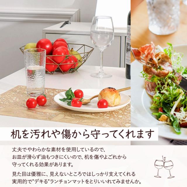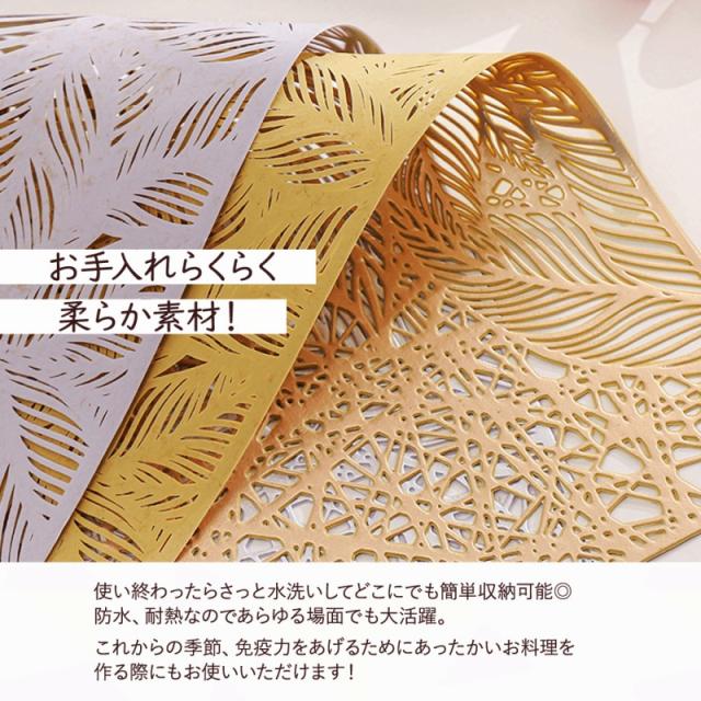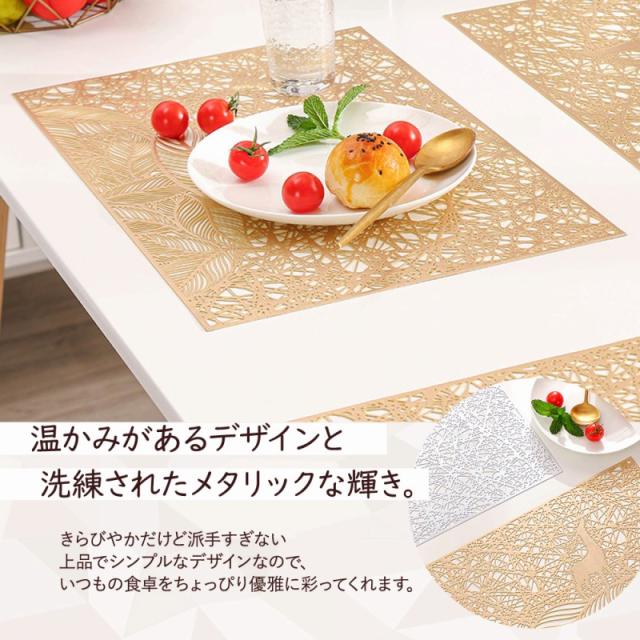 | 商品の説明 | 敷くだけで、食卓をおしゃれに! ランチや晩ごはんなど食事の際に大活躍するランチョンマット。 きらびやかだけど派手すぎない上品でシンプルなデザインなので、 いつもの食卓をちょっぴり優雅に彩ってくれます。 使い終わったらさっと水洗いしてどこにでも簡単収納可能◎ 防水、耐熱なのであらゆる場面でも大活躍。 さらに丈夫でやわらかな素材を使用しているので、お皿が滑らず油もつきにくいので、 机を傷やよごれから守ってくれる効果があります。 上品で華やかなゴールドと、清廉なシルバーをそれぞれ2枚ずつのうれしい4枚セット。 お世話になったお友達や大好きなあの人に、離れて暮らす家族へのプレゼントなどにも。 ご時勢柄、なかなか会えない日々も お揃いのランチョンマットをプレゼントして 身体を思いやる気持ちを贈ってみませんか。 |