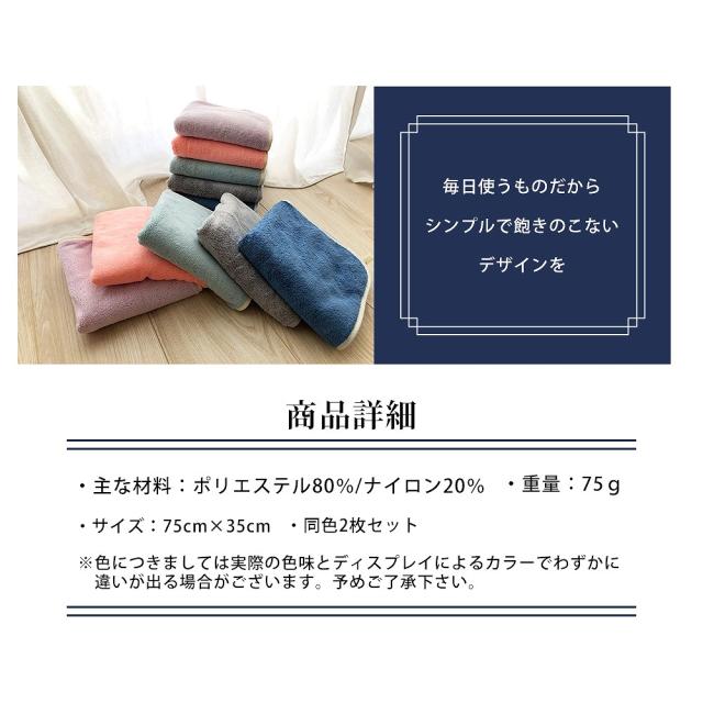 | 主な仕様 | ●商品内容: フェイスタオル2枚セット ●カラー : 以下からご選択ください グレー/ネイビー/ブルー/パープル/ピンク ●サイズ: 約35×75cm |