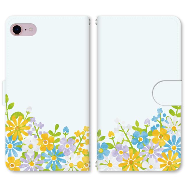 スマホケース 手帳型 iPhone13 iPhoneSE2 アイフォン 8 aquos sense GooglePixel xperia galaxyなど多機種制作対応 m077_水彩 ブルーの花畑