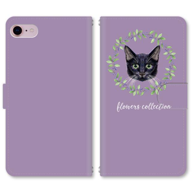 スマホケース 手帳型 iPhone13 iPhoneSE2 アイフォン 8 aquos sense GooglePixel xperia galaxyなど多機種制作対応 m098_パープル黒猫