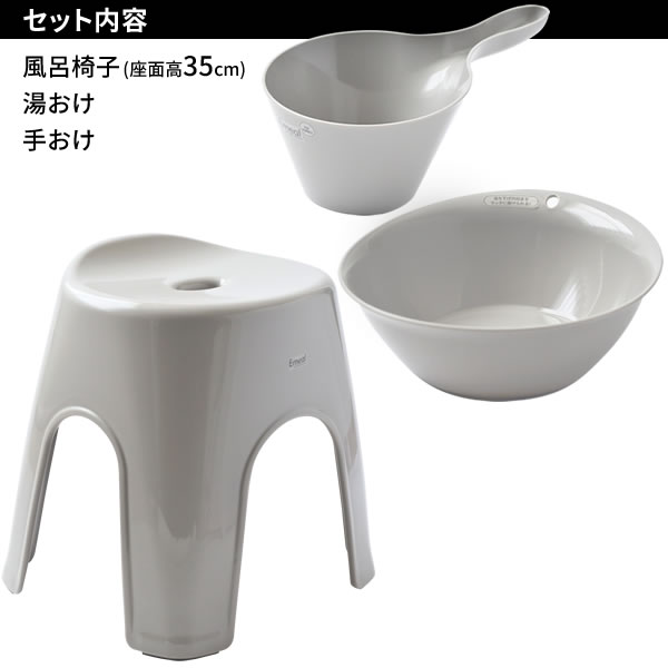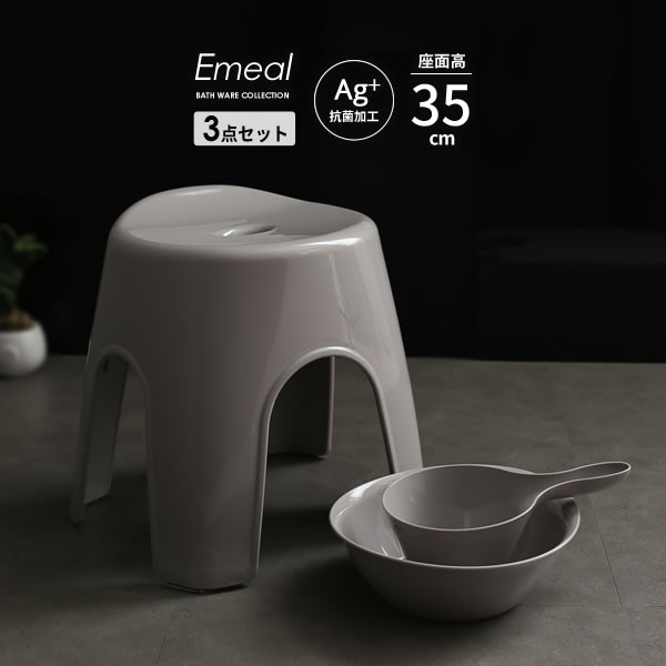 風呂椅子セット Emeal エミール 3点セット(手おけ+湯おけ+風呂イス) 座面高さ35cm グレー | バスチェア バススツール 手桶 湯桶 風呂いす ニュアンス くすみ カラー バス用品 腰掛け 浴室 洗い場 抗菌