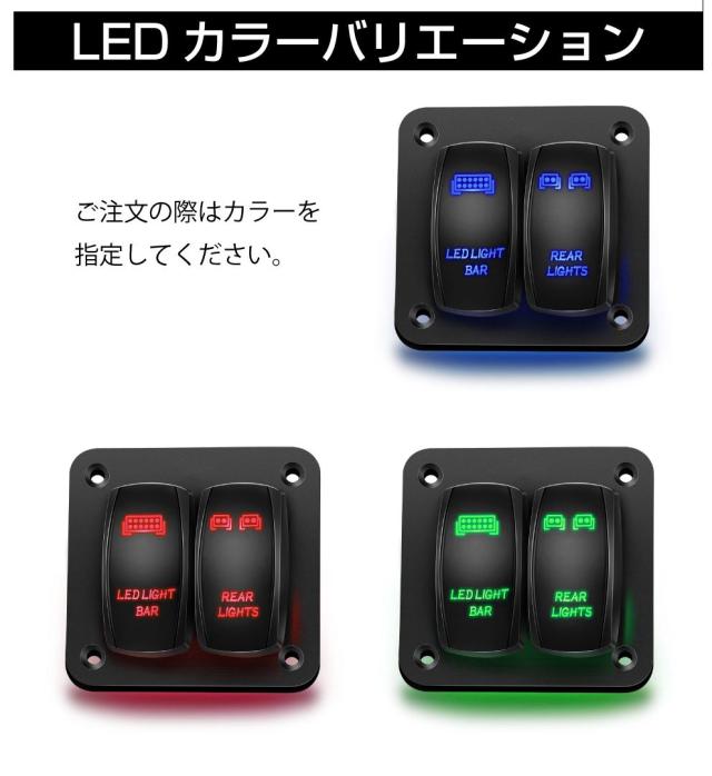 ・キャンピングカーからボート、トラックや普通車まで幅広く使用できるスイッチパネルです。 ・このパネル1つで3つの電装品のON/OFFを管理できる3連ロッカースイッチです。 ・LEDの配線を繋いで光る選べる3色のLEDがスイッチを彩ります。 |