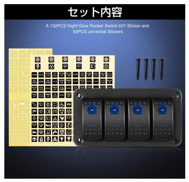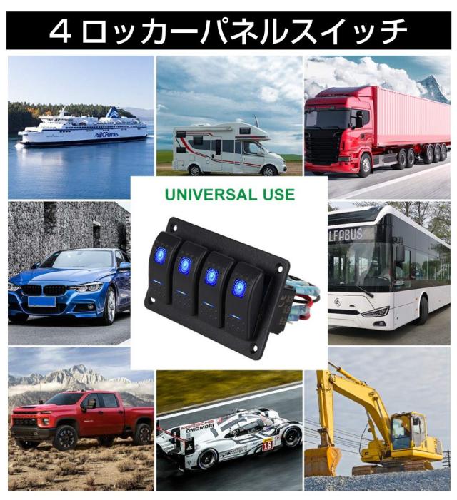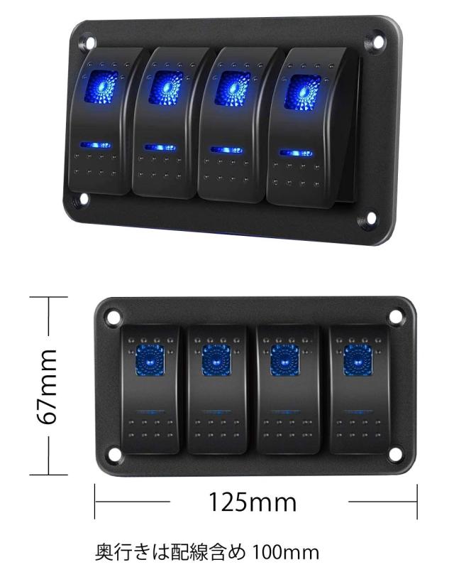 ・キャンピングカーからボート、トラックや普通車まで幅広く使用できるスイッチパネルです。 ・このパネル一つで4つの電装品のON/OFFを管理できる4連ロッカースイッチです。 ・LEDの配線を繋げばブルー発光のLEDがスイッチを彩ります。 ・スイッチ部分は防水仕様なので船上でも安心してご使用いただけます。 |