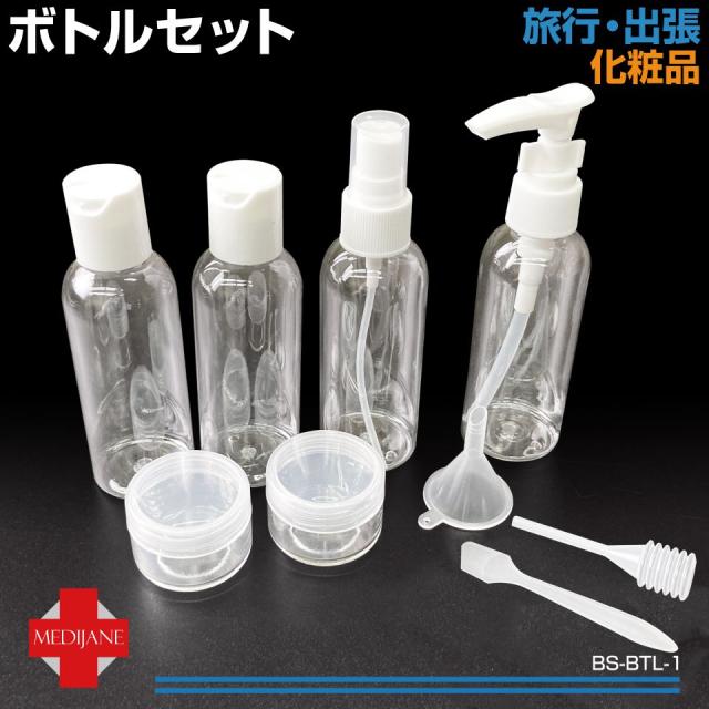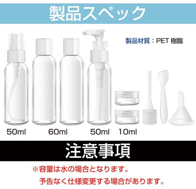 シャンプーボトル×1 ボタン式ボトル×2 スプレーボトル×1 クリームケース×2 スポイト×1 ヘラ×1 ジョウゴ×1 専用ケース×1 |
