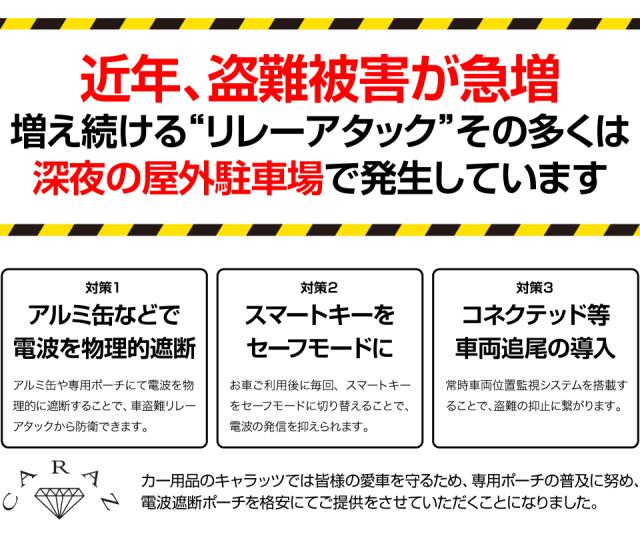 ・車の盗難リレーアタック・クレジットカードのスキミングを防止する電波遮断用のケースです。 ・リレーアタックによる車盗難の被害が増えている昨今。大事な愛車をリレーアタックによる盗難から防ぎましょう! ・スマートキーにセーフモードが搭載されている車もありますが、まだまだ少数。更に毎回設定するのが手間に… ・このボックスは電波を遮断する素材なので、帰宅時にこの中に入れて置くだけで簡単にリレーアタックを防止することができます。 ・一個であればほぼ全車種のスマートキーが一個入るコンパクトサイズ! ・フタの締め忘れ時等に電波を受けた際に囮電波を放出するデコシールが付属しています。 |