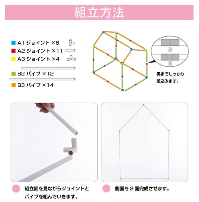 本体 組立用パイプ、ジョイント一式 カラーボール×50球 LED照明×1(クラブハウスに本体ブルーのLED、アイスクリームショップに本体ピンクのLEDがセットとなります。) |