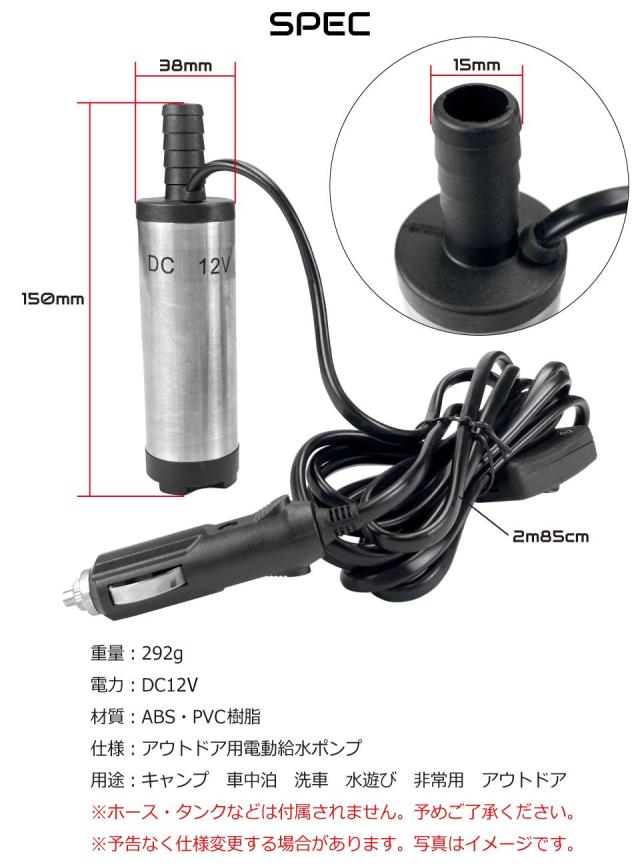 ・タンクの水を電動で給水ができる電動給水ポンプです。 ・口径サイズが38mm以上のポリタンクであれば使用可能です。 ・防水加工が施された専用ポンプなのでケーブルごとタンクに入れて使用できます。 ・必要な分だけその都度使用ができるON-OFFスイッチ付きなので便利です。 ・車やポータブル電源で簡単に電源が取れるシガープラグ式! |
