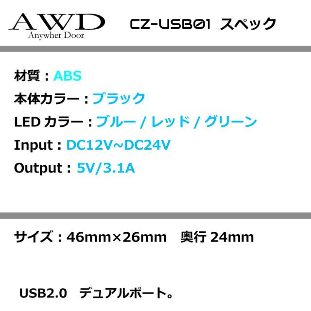 キャンピングカー/ボート デュアルUSBポート 3.1A LED3カラー DC12V DIY カスタム 船 CZ-USB-01 翌日配達 送料無料
