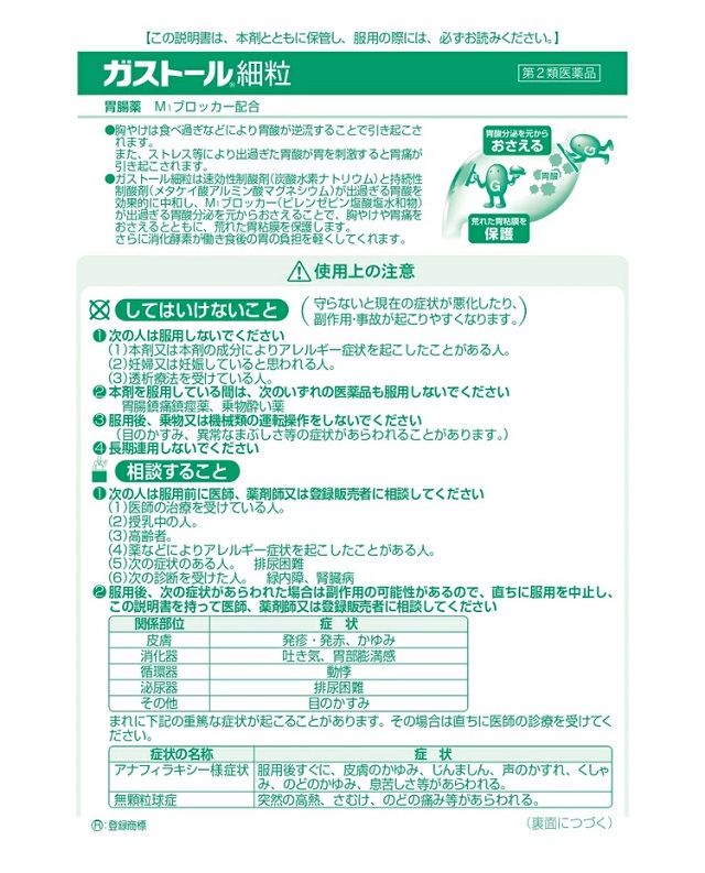 ガストールは「胃痛」や「胃酸逆流などによる胸やけ」によく効く胃腸薬です。速効性制酸剤と持続性制酸剤が出過ぎた胃酸を中和し、M1ブロッカー(ピレンゼピン塩酸塩)が過剰な胃酸分泌を元からおさえ、胃粘膜を修復します。また、食後に服用いただくことで、胃や食道を傷つける過剰に分泌された胃酸をコントロールし、胸やけや胃痛を効果的に抑えます。※こちらの商品は「医薬品」です。医薬品には、健康被害を避けて有効に使用していただくために用法・用量などの使用方法が定められています。用法・用量を超えて使用すると、重大な健康被害につながるおそれがありますので、必ず使用方法をお守りください。
