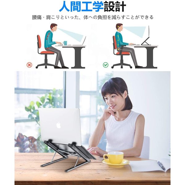 【6段階角度調節・姿勢矯正】本ノートパソコンスタンドは傾斜角度18°〜42°まで6段階の角度調整でき、好みや用途にあった角度が設定できます。