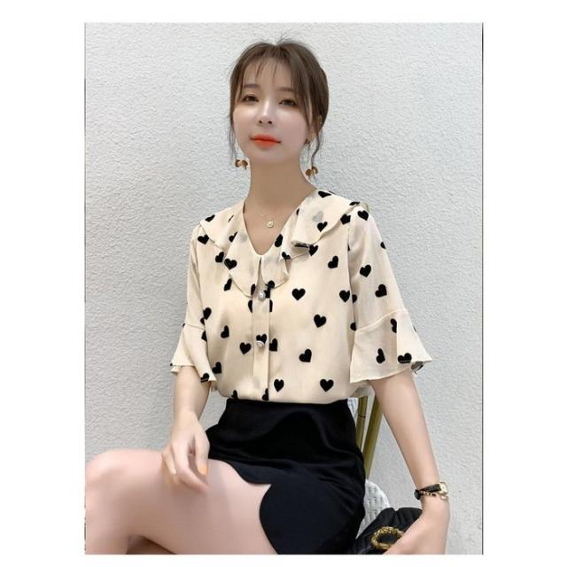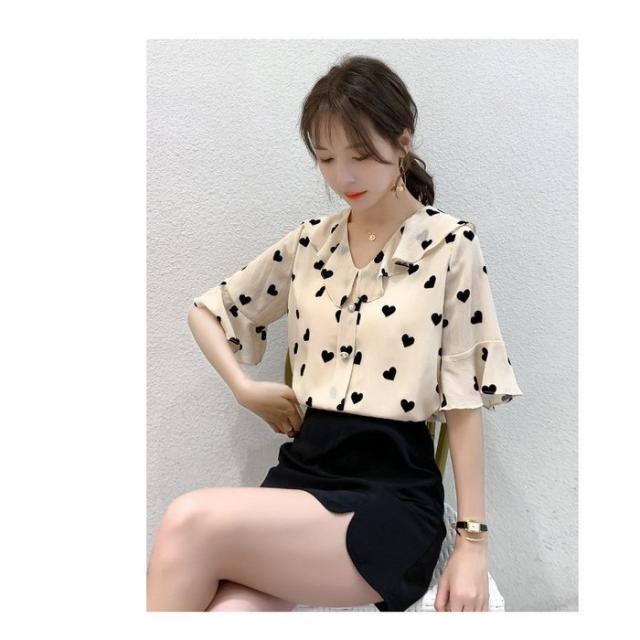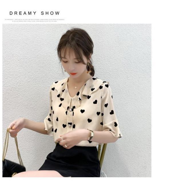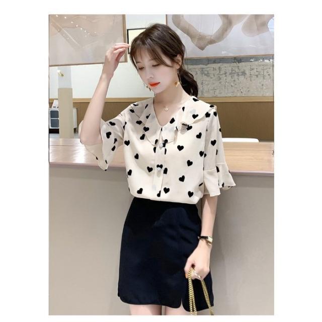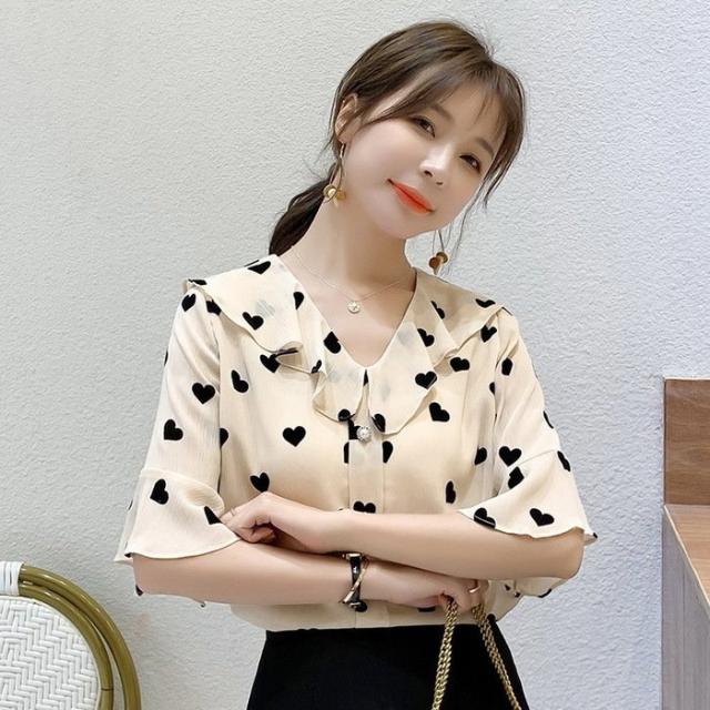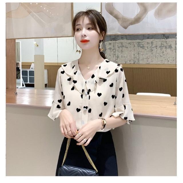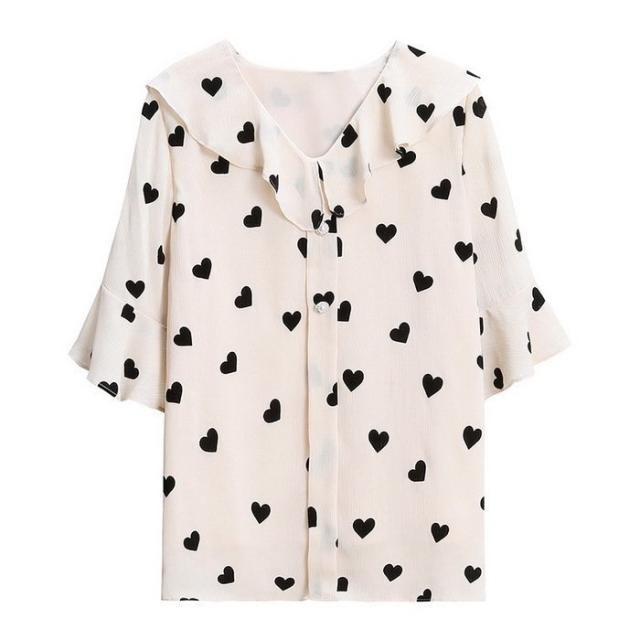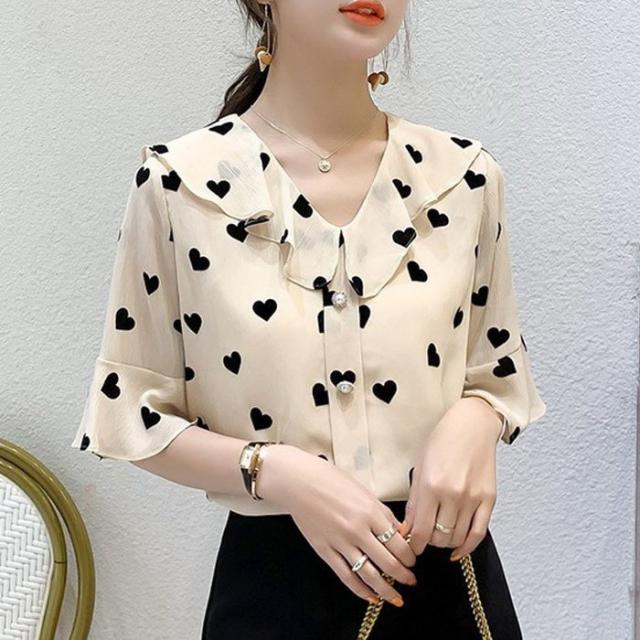 ブラウス レディース 40代 春夏新作 オシャレブラウス 五分袖ブラウスVネック ハート柄シフォンブラウス ゆったりトップス おしゃれ 大人 通勤OL 30代 50代