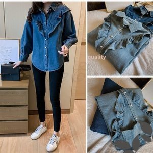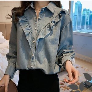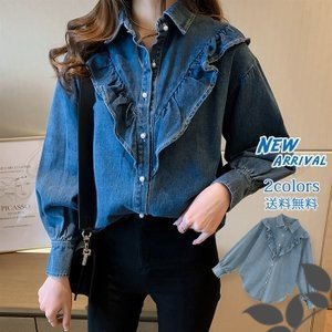 デニムシャツ レディース 長袖シャツ シャツブラウス フリル ゆったり カジュアル きれいめ 春秋 可愛い トップス おしゃれ