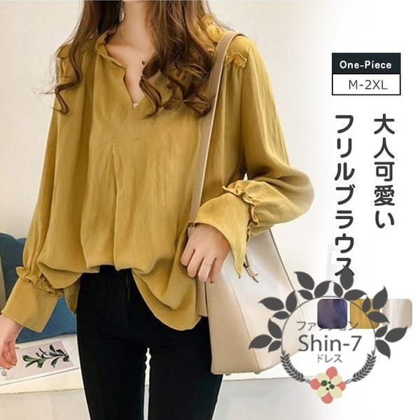 ブラウス レデイース 夏 秋 長袖 シャツブラウス フリル Vネック トップス 無地 ゆったり カジュアル おしゃれ 大人 上品 通勤 OL 20代 30代 40代 sy2463