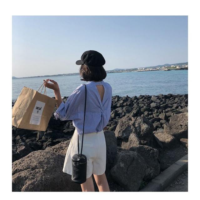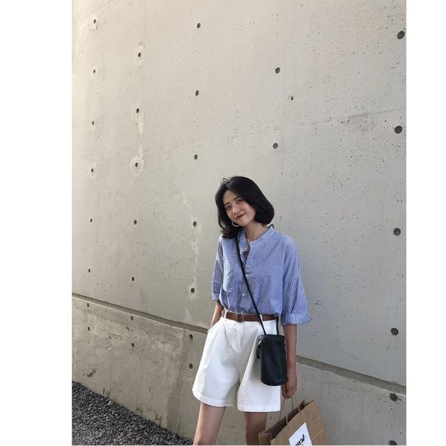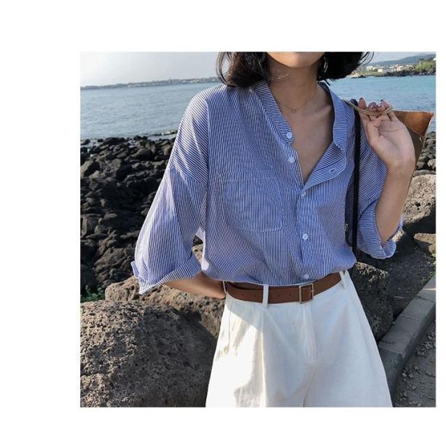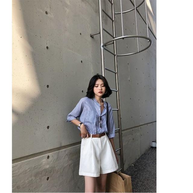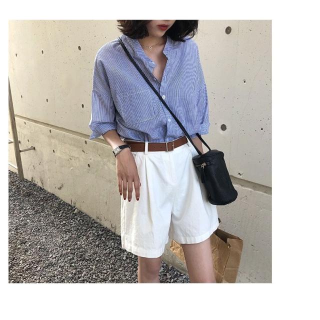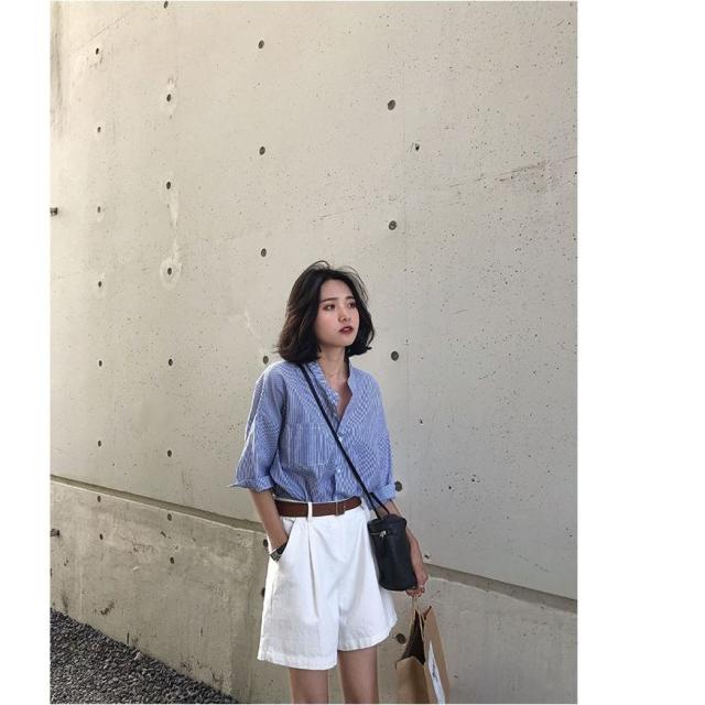セットアップ レディース ブラウス 7分袖 ストライプ ハーフパンツ トップス ボトムス カジュアル S M L XL