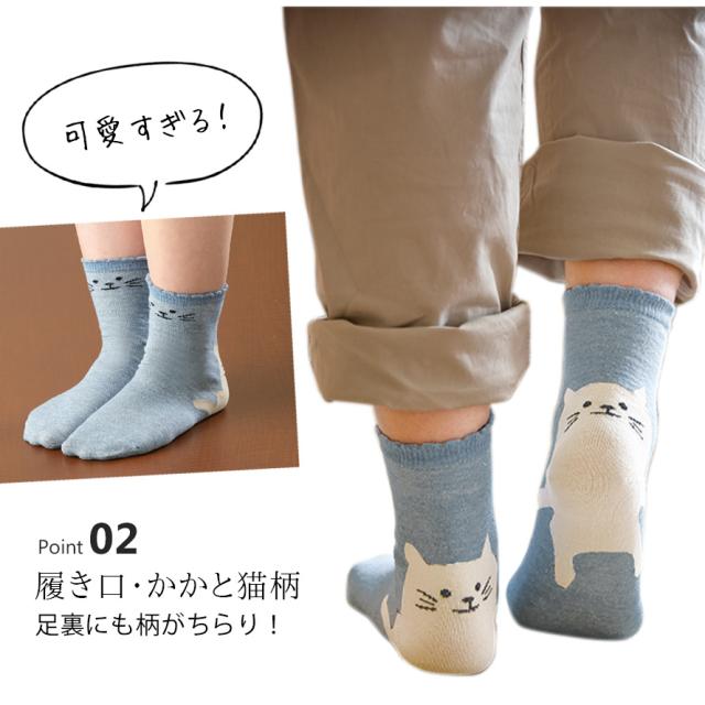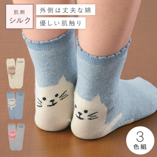靴下 レディース 猫 【3色組】22-25cm 猫柄 ネコ柄 ねこ おしゃれ 【 猫好きな方へオススメの猫柄靴下 】 内絹 外綿 シルク 綿 まとめ買い 3足 セット 動物 アニマル かわいい 内側シルク2層ねこ柄ソックス