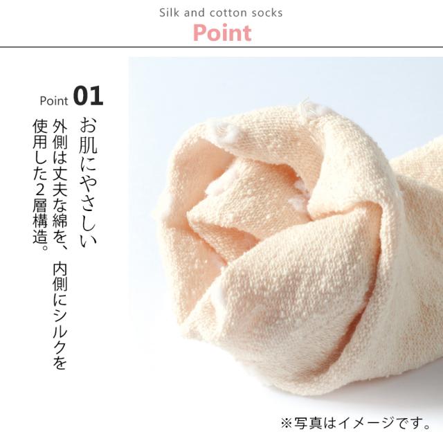 お肌に当たる内側がシルク!外側に丈夫な綿を使用し、お肌に当たる内側にシルク(約49%)を使用した2層構造ソックスです。