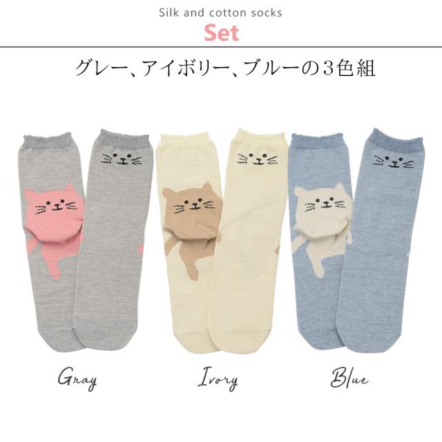 靴下 レディース 猫,ネコ柄 靴下,猫柄 靴下,靴下,くつした,くつ下,ソックス,婦人靴下,セット,3足組,シルク,綿,コットン,猫柄,猫,ネコ,ねこ,動物,アニマル,ブルー,青,グレー,アイボリー,日本製,やわらかい,柔らかい,ソフト,肌触り,ソフトタッチ,快適,心地よい,おしゃれ,お洒落,オシャレ,かわいい,可愛い,大人かわいい,大人可愛い,ベーシック,定番,ヘビロテ,ファッション,コーディネート,普段使い,デイリーユース,おすすめ,オススメ,素材,生地,気持ちいい,ギフト,プレゼント,プチギフト,贈り物,祝い,誕生日,誕生日プレゼント,クリスマス,敬老の日,長寿祝い,敬老会,還暦,古希,喜寿,大人,大人用,レディース,女性,女子,女の子,女性用,婦人用,ミセス,ウィメンズ,婦人,ママ,母,母親,お母さん,おばあちゃん,祖母,お年寄り,高齢者,シニア,20代,30代,40代,50代,60代,70代,80代,家族,ファミリー,お出かけ,外出,旅行,洗い替え,