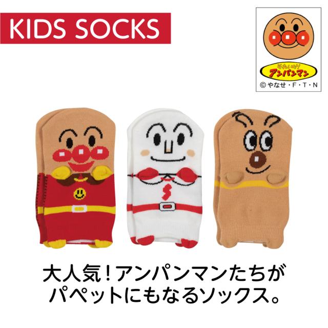 キッズに大人気!アンパンマンのキャラクター達がパペット風にプリントされた3柄組のソックスセットです。アンパンマン、しょくぱんまん、めいけんチーズの3柄で、お子さまが履いてお出かけするのが楽しくなる!