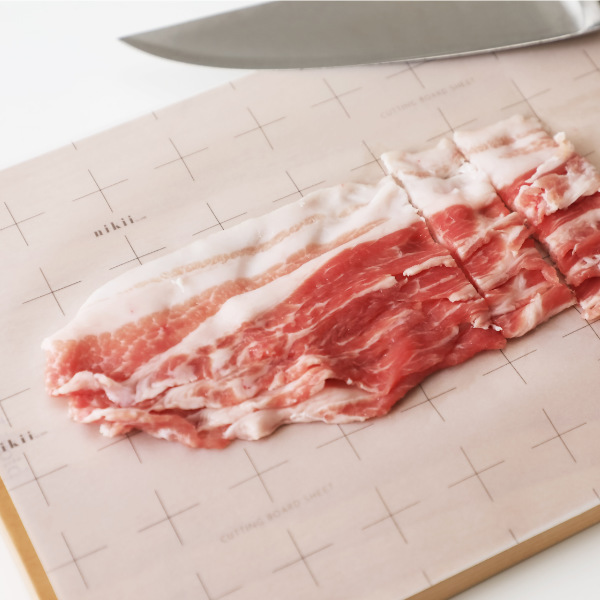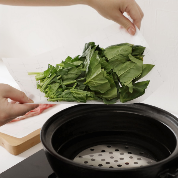 カットした食材をフライパンや鍋に移す際も、そのままシートを持ち上げれば簡単に移すことができます。
