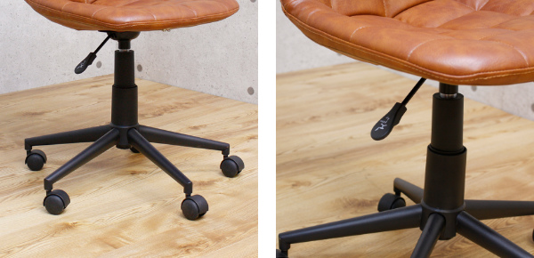 | 便利なキャスター付き 脚はキャスター仕様で移動がスムーズに行えますので、お掃除が簡単にできます。 | レバーで高さ調節可能 座面下のレバーを上げ下げすることで高さが変えられます。座面高約45〜52cmの間で調節ができますので、お好みの高さに合わせてお使いください。 |