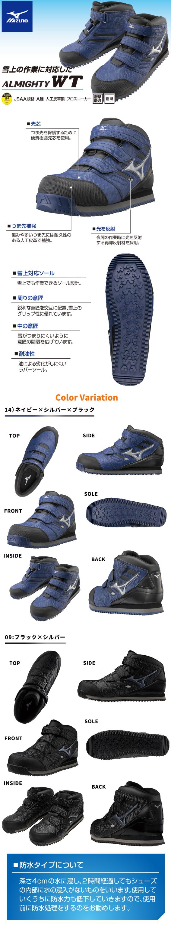 安全靴 ハイカット ミズノ MIZUNO オールマイティ 雪上防水シューズ メンズ ALMIGHTY WT F1GA180414 マジックテープ ミッドカット JSAA規格 2023年 新作 限定 防水 寒冷 寒冷地仕様 耐滑 軽量 雪上 雪上対応 人工皮