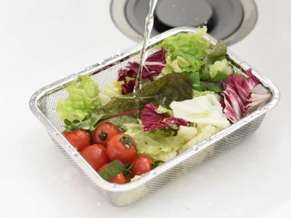 角ザルは別売りの角バットにすっぽりと収まるジャストサイズです。角バットに入れたまま蓋をすることができるので、野菜を洗った後に水切りをし、そのまま蓋をして保存することができます。