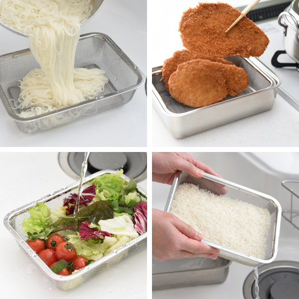 麺類の湯切りや揚げ物の油切り、野菜を洗ったり、お米を研いだり、幅広く使っていただけます。