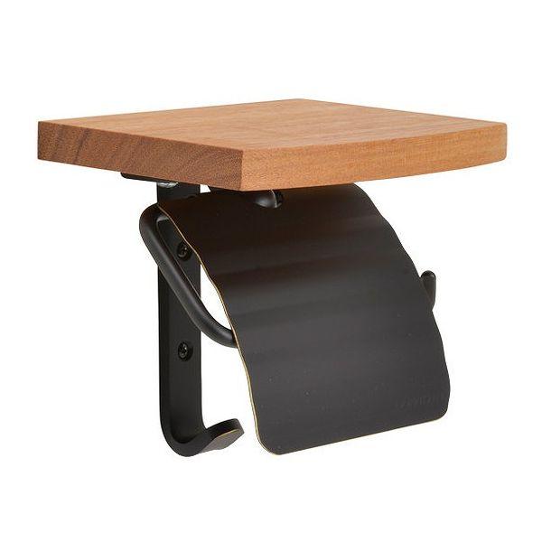 トイレットペーパーホルダーにウッドシェルフが付いた、美しくも便利な一品です。ペーパーストッカーをかけるフックもついています。