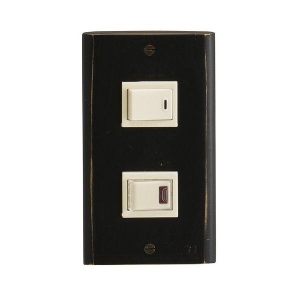 2つ穴のスイッチカバーです。シンプルなストレートデザイン。控えめながらさり気ないインテリアとしてオススメです。。高級感の高い、つや消しのブラックを塗装した仕上げです。アンティークな風合いを感じるブラックです。