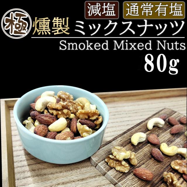 極燻製 桜チップの選べる [ミックスナッツ 80g SN] メール便 宮城県塩釜産 藻塩 有塩 アーモンド カシューナッツ クルミ おつまみ 自家製 無添加 保存料不使用 家飲み 宅飲み スモークナッツ おやつ 全国一律 送料無料 NP