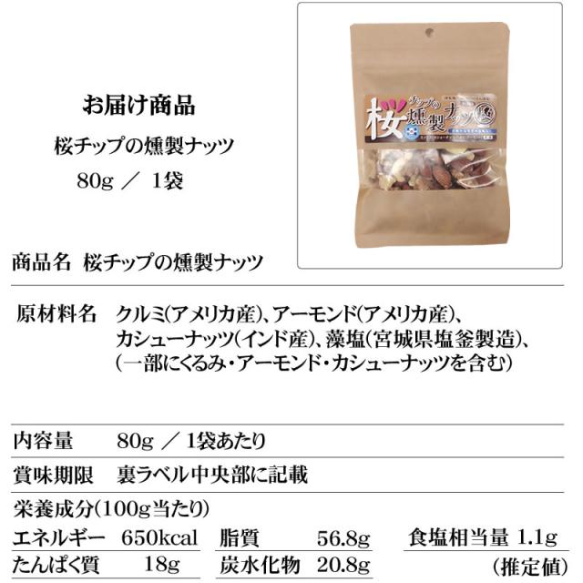 宮城県塩釜産の藻塩で味付け、桜チップ100%の燻製ナッツ。アーモンド・くるみ・カシューナッツのミックスです。袋を開けた習慣に、スモーキーな燻製の香りが楽しめます。職人のこだわりが詰まった燻製ミックスナッツ。宮城県塩釜市産の藻塩を細かなパウダー状にして味付け。甘みも感じられるほど、マイルドな仕上がりで、香ばしいナッツの風味を引き立てます。通常有塩タイプと減塩タイプの2種類をご用意。アーモンド・くるみ・カシューナッツ、それぞれには、日々の健康を保つための栄養素が豊富に含まれています。小腹が空いたときや、お酒のおつまみに、健康維持のための補食としてなど、是非お試し下さい。