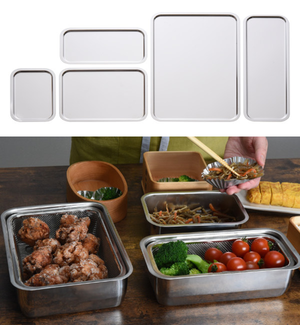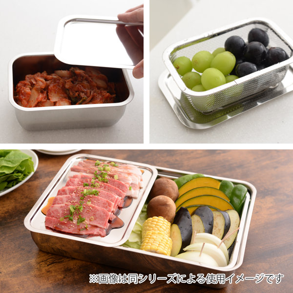 別売りの角バットや角ザルと一緒に使う事で蓋や水受け、食材の一時置きなど、自分流にカスタマイズしてお使いいただけます。