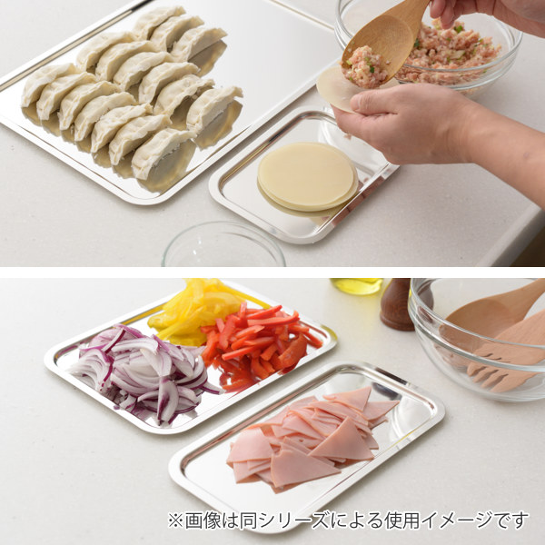 サビにくく耐久性に優れた18-8ステンレスのトレーです。浅い形状なので、食材が取り出しやすく、調理の下ごしらえに活躍します。
