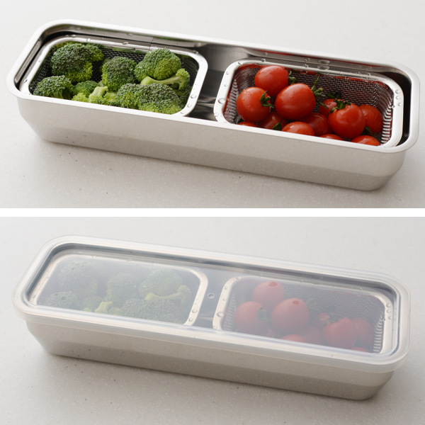 同シリーズの1/4サイズの角ザルがスッポリ入り、角バットに入れたまま蓋をすることができます。他のサイズと組み合わせて、さらに便利に使えます。