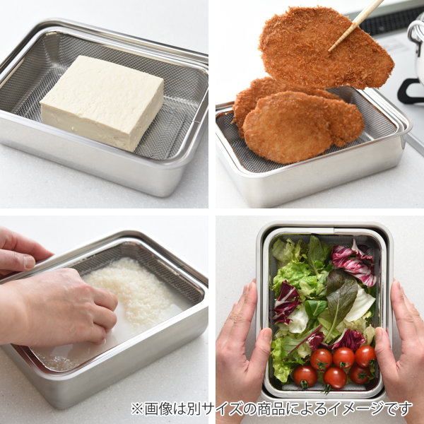 それぞれの役割はもちろん、バットとザルを合わせて使うことで、お米を研いだり、豆腐や野菜の水切り、揚げ物の油切りなど幅広く使っていただけます。