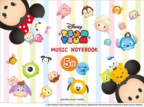 表紙、中面、付属シールに、ツムツムのキャラクターがたくさん詰まった横型五線ノート! 中面は1ページに五線を5段掲載。便利なミニ楽典ページ、シール付きです。