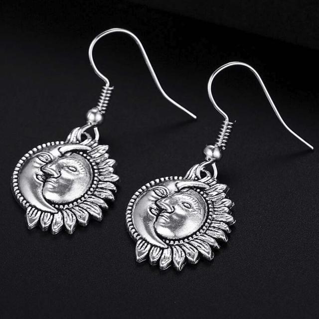 顔のある三日月と太陽をモチーフにしたチャームが揺れるフックタイプのステンレスピアス。